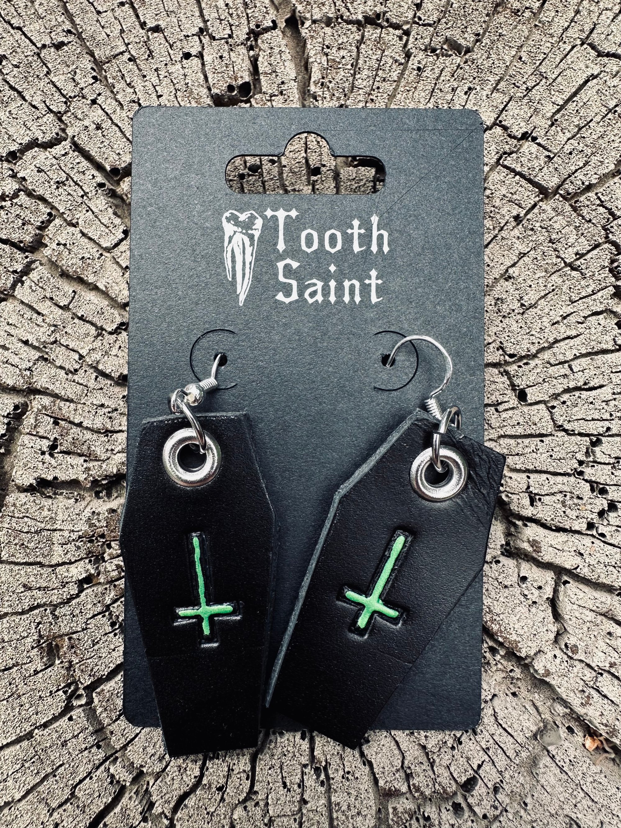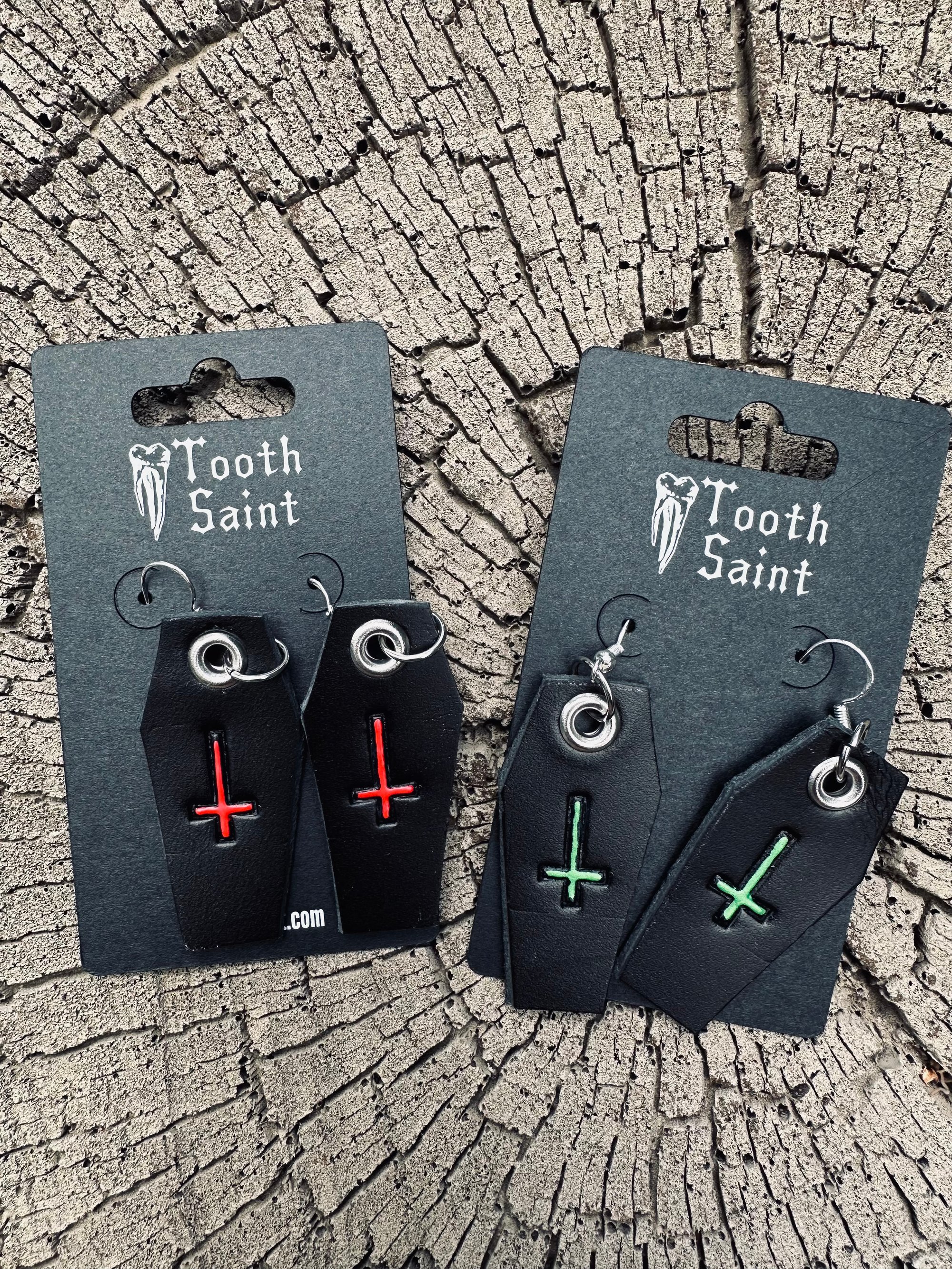 Leather cross earrings. Hand cut, stamped, and painted with an upside down cross. Sterling silver hardware.