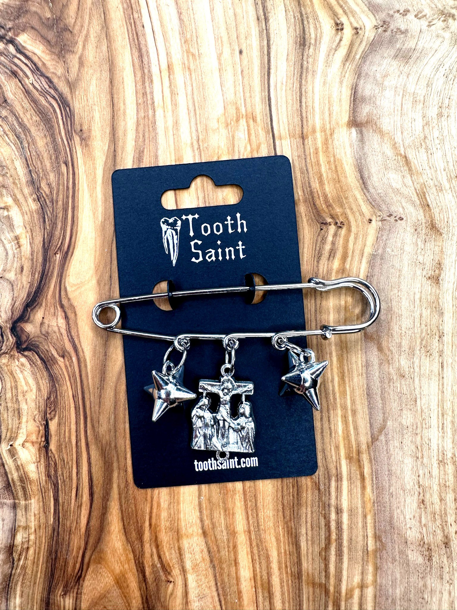 Each brooch is made from a crucifix from a vintage lot, assembled by hand and attached to an extra-large safety pin. Designed to be worn as adornment, they’re versatile enough to be styled on a jacket, hat, or bag.