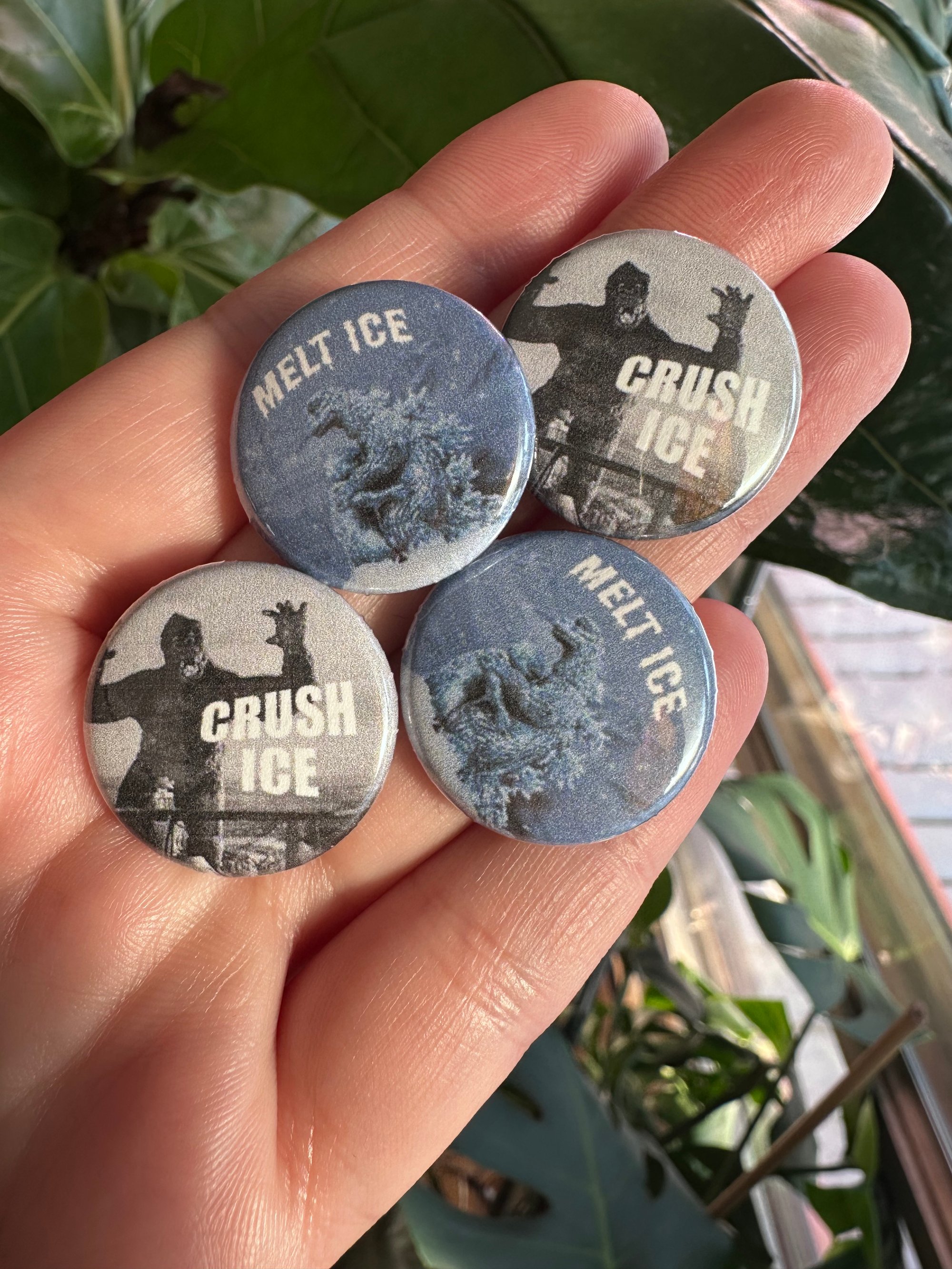 Godzilla "Crush ICE" or King Kong "Melt ICE" pins. 100% of proceeds from these pins will go to local mutual aid groups in Minneapolis. Here is a list of local groups if you would like to make any additional donations.