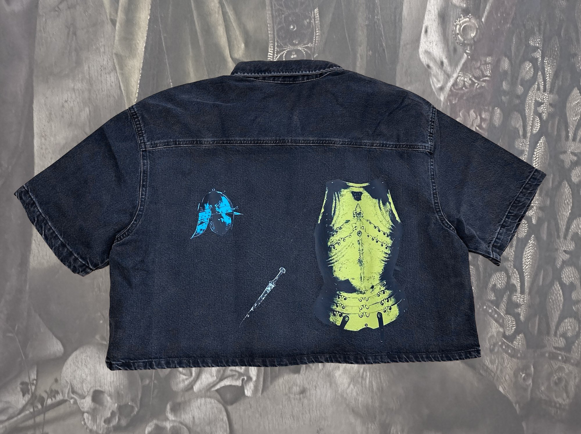 Each button-down is completely one of a kind and printed by hand in our studio. From design to application, using carefully sourced materials and high quality blanks. We pay full retail price for this shirt and the price reflects the cost, time, skill, and intention behind an original, wearable artwork- not mass-produced merchandise. Printed on Dickies brand faded black denim.