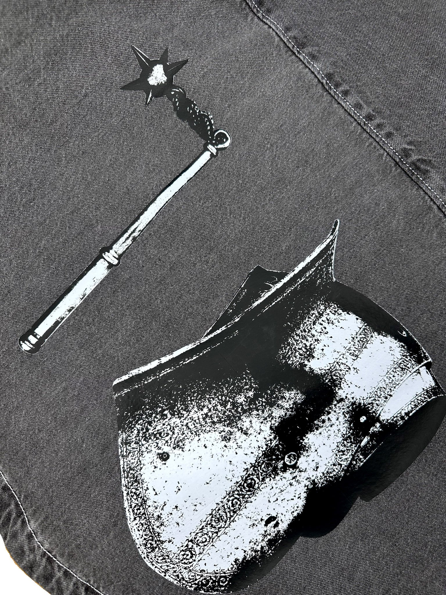 Each button-down is completely one of a kind and printed by hand in our studio. From design to application, using carefully sourced materials and high quality blanks. We pay full retail price for this shirt and the price reflects the cost, time, skill, and intention behind an original, wearable artwork- not mass-produced merchandise. Printed on Vans brand faded black denim.
