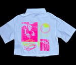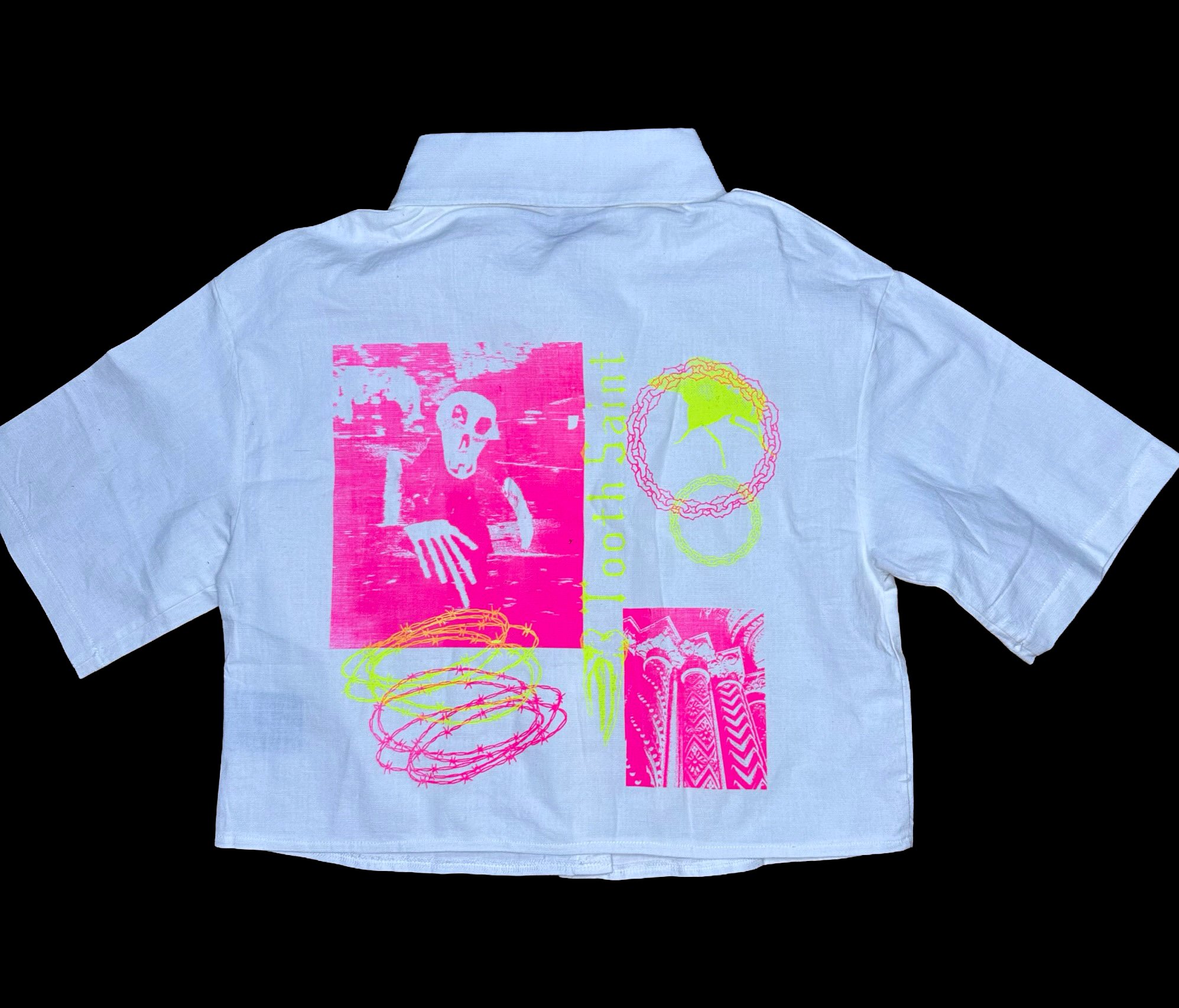 This neon cropped button-up features original imagery photographed by Christina and illustrated by Leda, created exclusively for this piece. Each shirt is produced through an intensive, hands-on process that takes over three hours per garment across a two-week period, with individual screen-printed images applied one by one. From image creation to printing and finishing, every step is done in-house and by hand. The price reflects the time, labor, and care behind a truly small-batch garment made as a genuine labor of love.