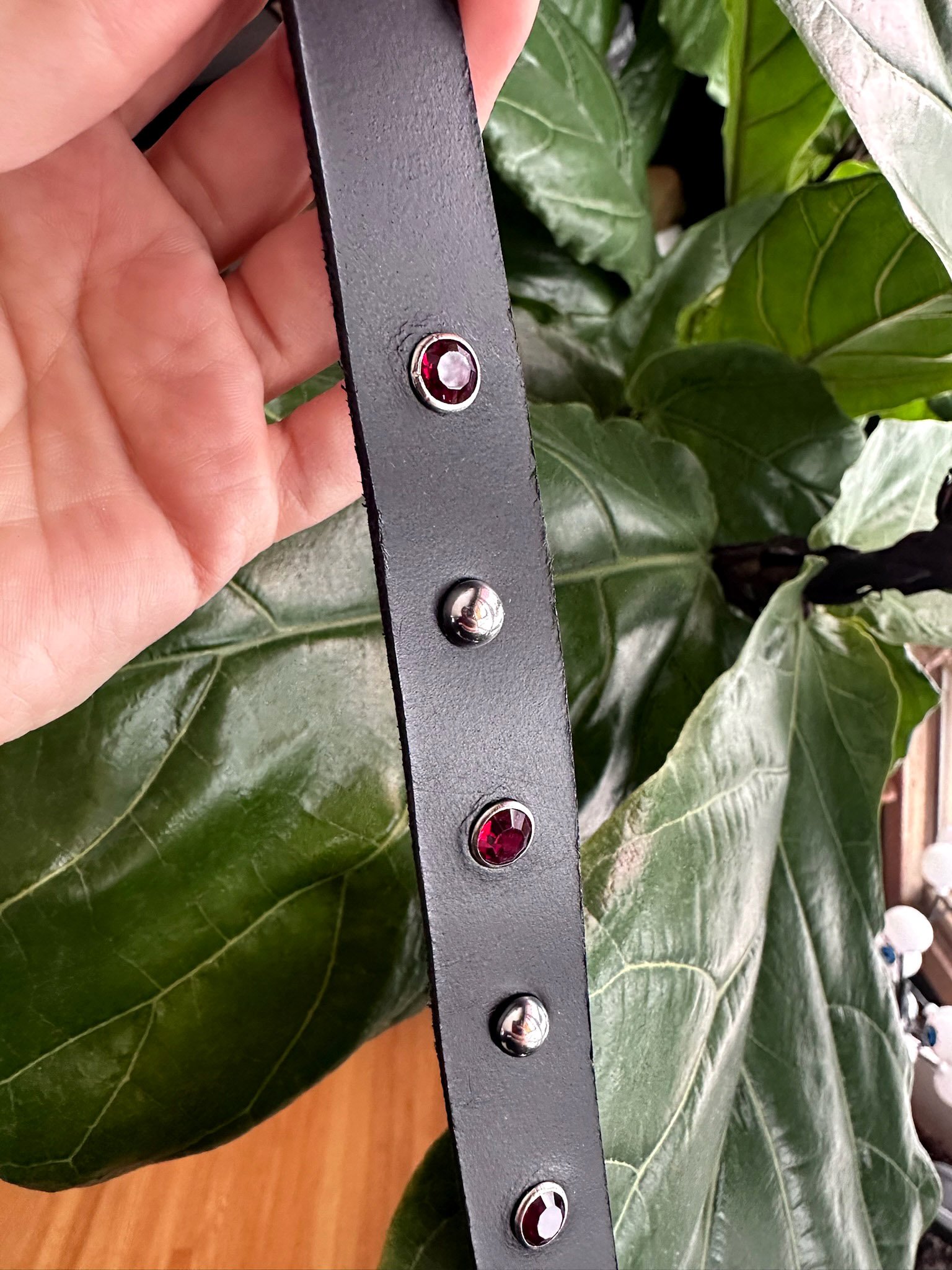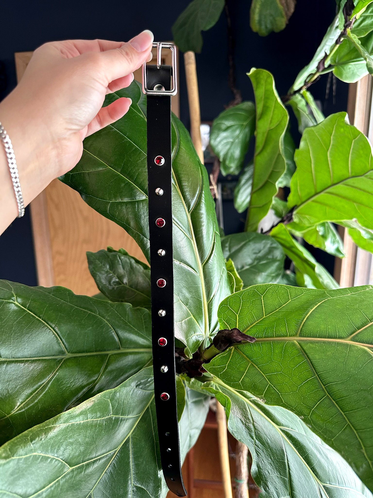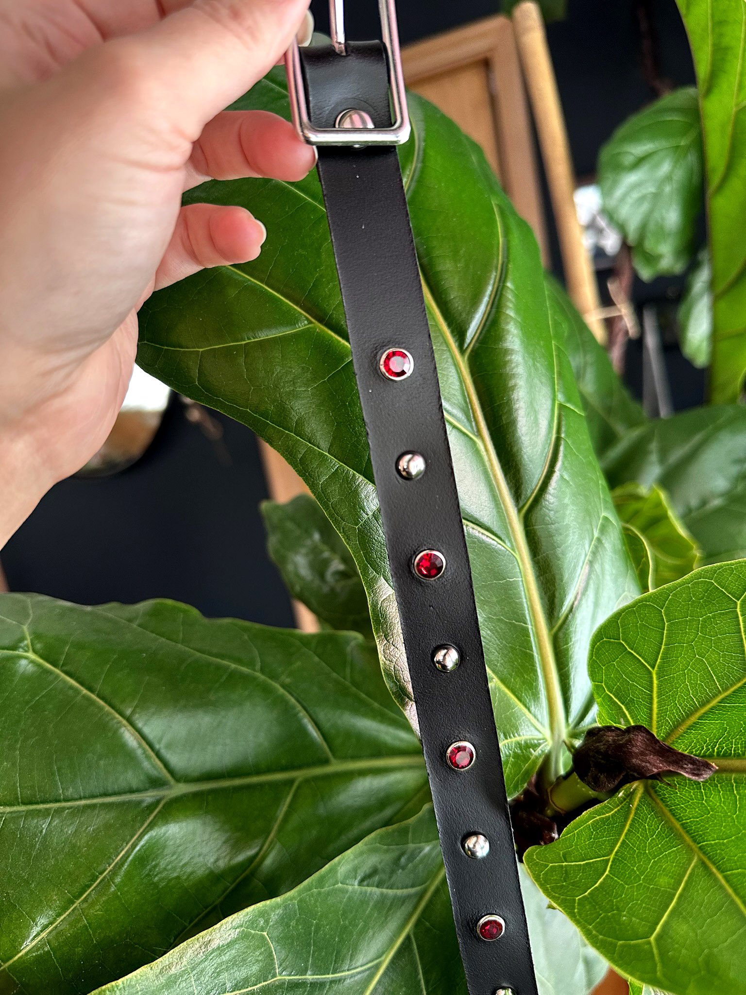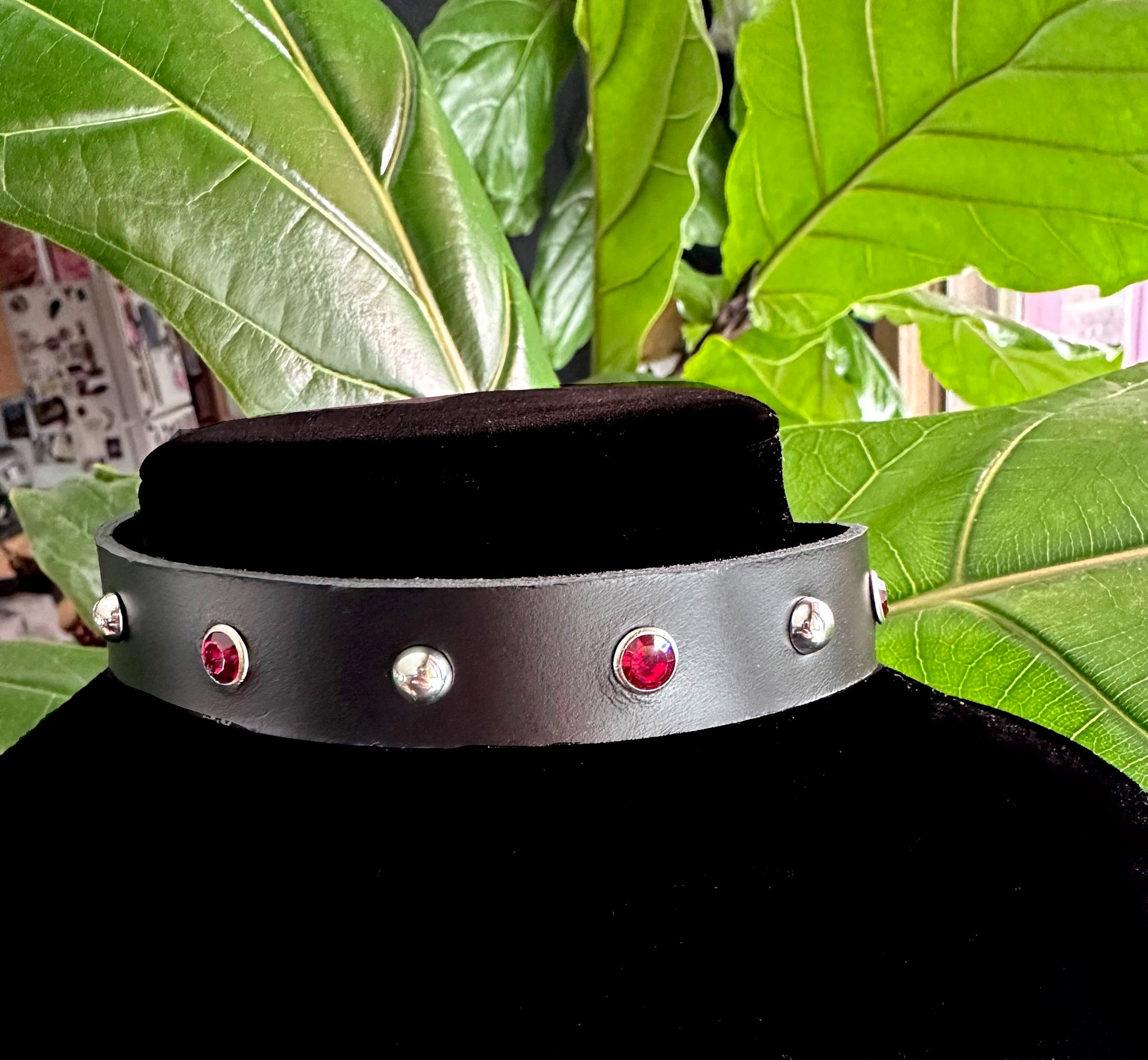 The choker is constructed from premium, full-grain leather, hot-stuffed with oils and waxes for a rich, lasting finish. Blood-red rhinestones and round rivets are hand-set around the band.