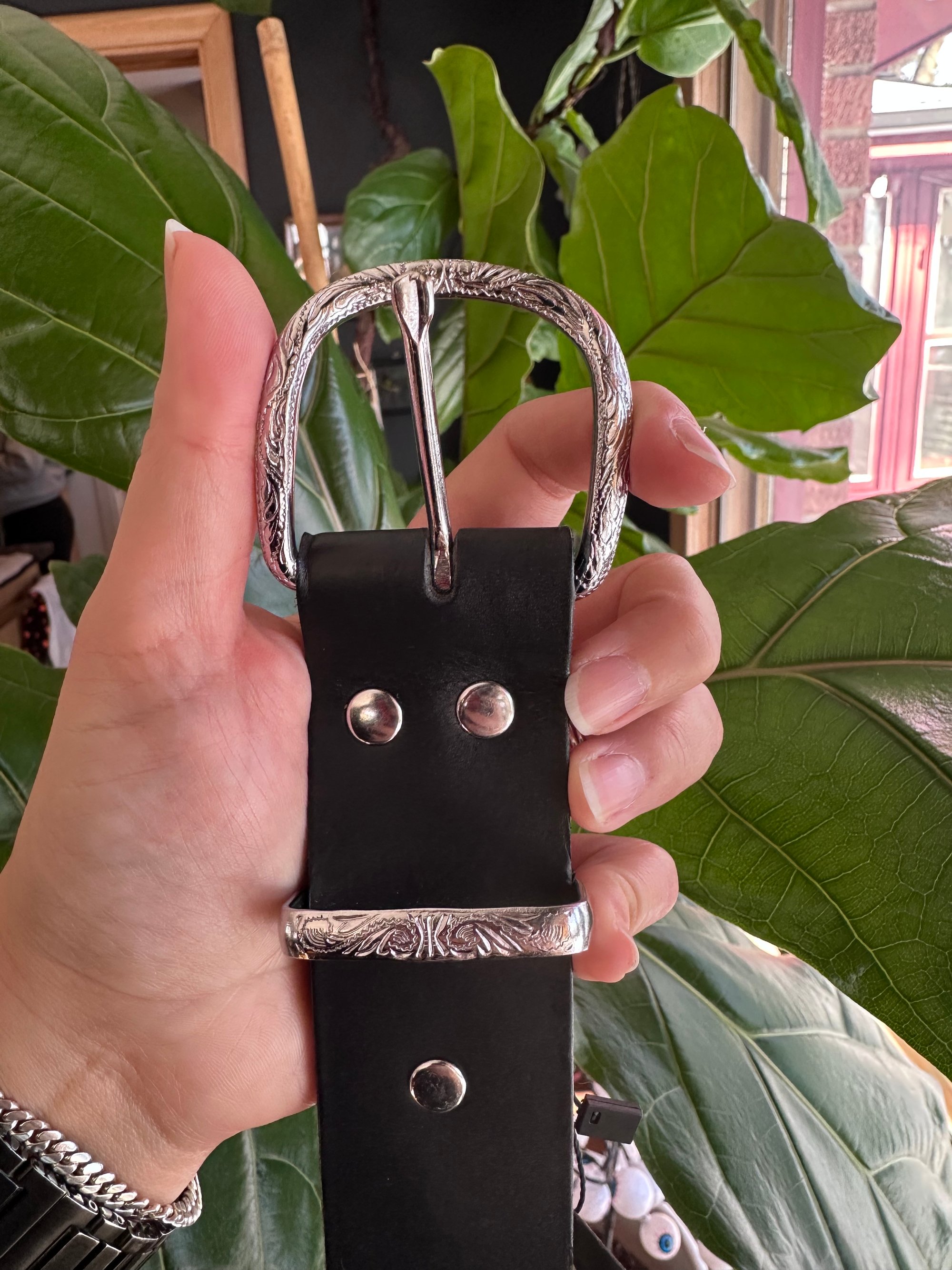 Inspired by a 1940s tattoo photograph of Captain Elvy wearing a rhinestone-studded belt. Each belt is crafted from 8oz full-grain vegetable-tanned leather, a premium material chosen for its durability, natural finish, and ability to age beautifully over time. This is the same caliber of leather used in heritage saddlery and archival leather goods, designed to last for decades. The leather is hand-cut, not die-cut or mass-produced and each rivet and rhinestone is individually set by hand, one at a time.